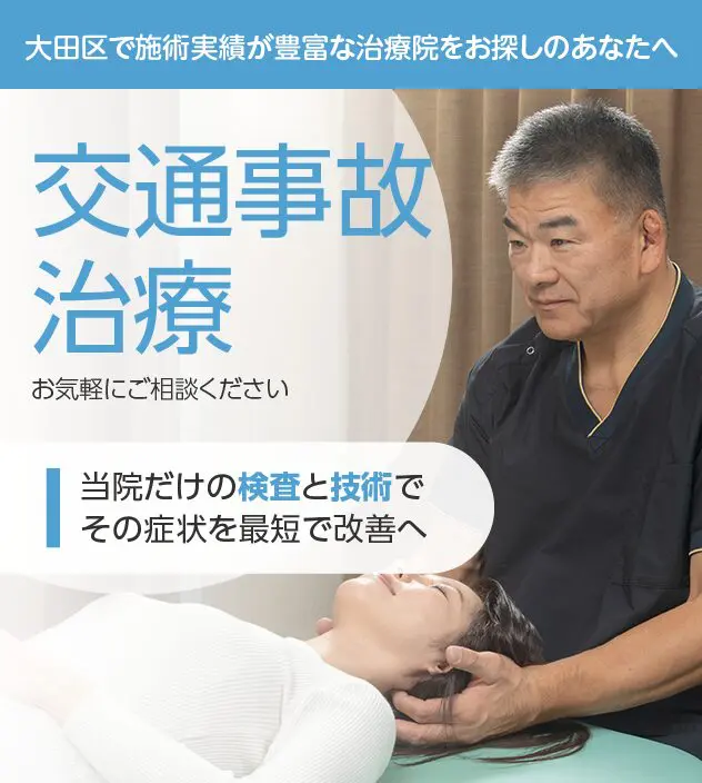 交通事故治療とは、交通事故によって生じた身体の痛みや不調を改善するための治療のことです。特に「むち打ち症」や「腰椎捻挫」と呼ばれる首や腰の痛みをはじめ、頭痛、めまい、手足のしびれなど様々な症状に対して、自賠責保険や任意保険を使って行う治療を指します。