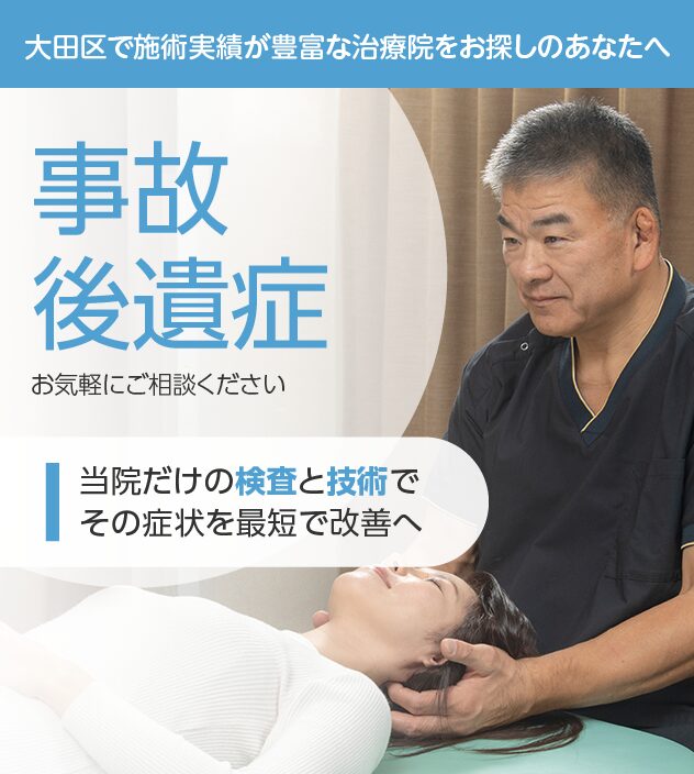 病院や他の治療院で改善しなかった事故後遺症でお悩みの方も諦めないでください。当院では、お一人おひとりの症状に合わせた丁寧な検査と施術で、事故後遺症の根本的な改善と再発予防を目指します。
