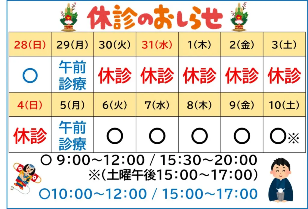 年末年始の休診日のお知らせ 2025 12/09 症状検索 本日の予約状況 目次年末年始の休診日のお知らせ いつも荏原整体院・接骨院をご利用いただき、誠にありがとうございます。年末年始の診療スケジュールは下記の通りとなります。 12月29日(月)午前診療 12月30日(火)~1月4日(日)休診 1月5日(月)午前診療 1月6日(火)通常診療 ご不便をおかけいたしますが、何卒ご理解のほどよろしくお願いいたします。皆さま良いお年をお迎えください。 院長:別所 どんなお悩みもお気軽にご相談ください 住所東京都大田区東矢口2-14-15電話番号03-3750-4565定休日祝日 24時間受付中 お知らせ 気軽にシェアしてください URLをコピーする URLをコピーしました!